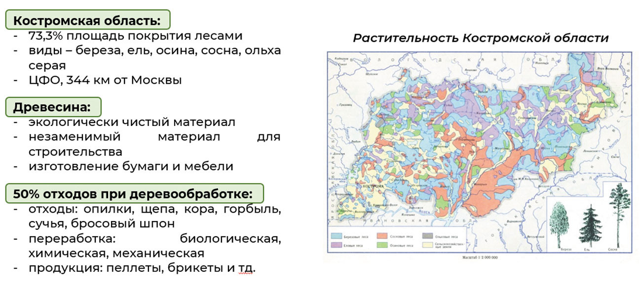 Локацией для бизнес-проектирования было выбрано с. Воронье Судиславского района Костромской области. В этом месте выставлена на продажу промышленная площадка необходимой площади, а также вблизи находятся поставщики сырья и удобные логистические пути. В этом регионе достаточное количество лесных ресурсов и есть проблемы с утилизацией древесных отходов, кроме того область находится в ЦФО, относительно недалеко от рынков одного из крупнейших сбыта – Москвы и Московской области. Необходимо отметить, что в регионе уже реализованы подобные проекты компании «Свеза» и ряда других компаний, однако они находятся в иных точках региона.