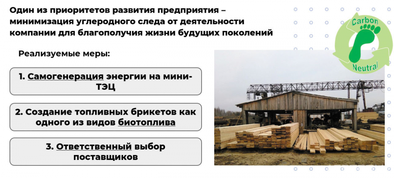 Главным приоритетом проектируемого предприятия является обеспечение экологической безопасности производства. В этом плане один из важных факторов – выбор источника энергии. Проанализировав разные способы генерации энергии, участники проекта пришли к выводу, что оптимальный вариант – выработка энергии на биотопливной мини-ТЭЦ, работающей на кородревесных отходах. Такая биотопливная энергетическая установка, а также использование в логистике и на производстве транспорта на природном газе позволит сократить выбросы СО2 на 76 тыс. т в год. Минимизация углеродного следа компании будет достигаться за счет полной переработки древесных отходов в брикеты, сорбенты (подстилку для животных) и золу.