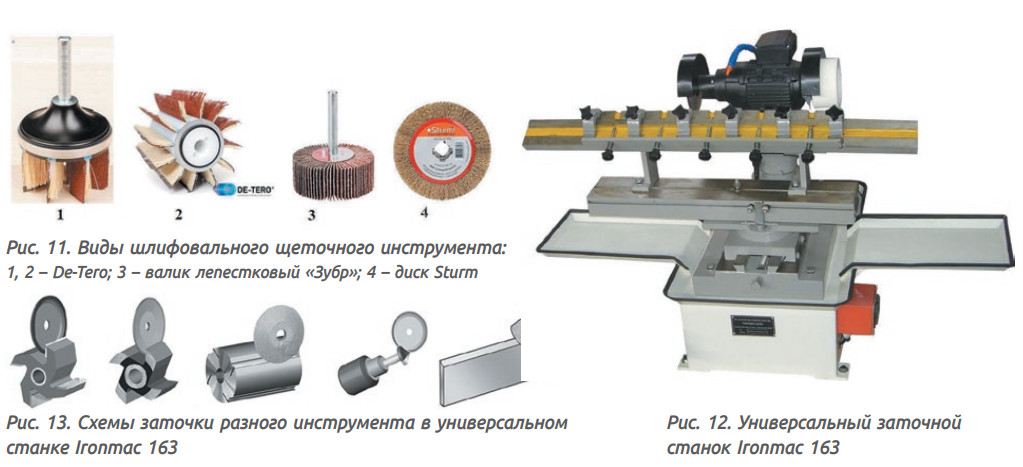 Заточное оборудование может быть представлено обычным точильным станком с абразивным кругом плоской, тарельчатой или чашечной формы. Для пил с напайками твердого сплава следует использовать круги с алмазным напылением. Ввиду многообразия режущего инструмента стоит выбрать универсальный заточной станок, например IRONMAC-163 (рис. 12, 13). Максимальные размеры фрез (D × d × B) 200 × 40 × 150 мм, плоских ножей (L × B) 630 × 40 мм, диаметр хвостовика концевой фрезы 3–13 мм, диаметр пил 120–500 мм. Мощность 0,55 кВт, вес 60 кг.