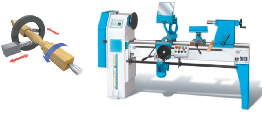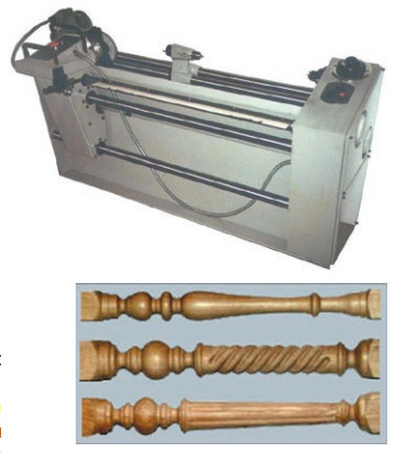 В копировальном токарно-фрезерном станке (рис. 4) обработка древесины осуществляется не токарными резцами, а высокооборотными вращающимися фрезами, по шаблону. Обработка твердосплавной фрезой на порядок повышает производительность и стойкость инструмента и позволяет получать изделия, которые невозможно изготовить на традиционном токарном станке. Длина заготовки 50–1150 мм, диаметр 10–165 мм. Дисковая фреза 200 × 30 мм. Мощность станка 1,9 кВт, габаритные размеры 1740 × 780 × 1050 мм, вес 550 кг.