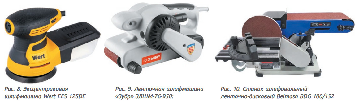 Шлифовальная лента в виде диска крепится к башмаку тканью типа «липучка» и легко заменяется. В ленточных шлифовальных машинках (рис. 9) используется бесконечная лента, склеенная под углом 45 градусов. Мощность 950 Вт, скорость ленты до 6 м/с, лента 533 × 76 мм, вес 3,6 кг. Срок службы такой машины до пяти лет.